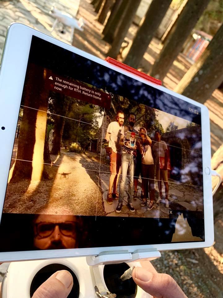 Cinque minuti e siamo già in volo sui tetti della foresteria, nel viale alberato che trascina alla stele.