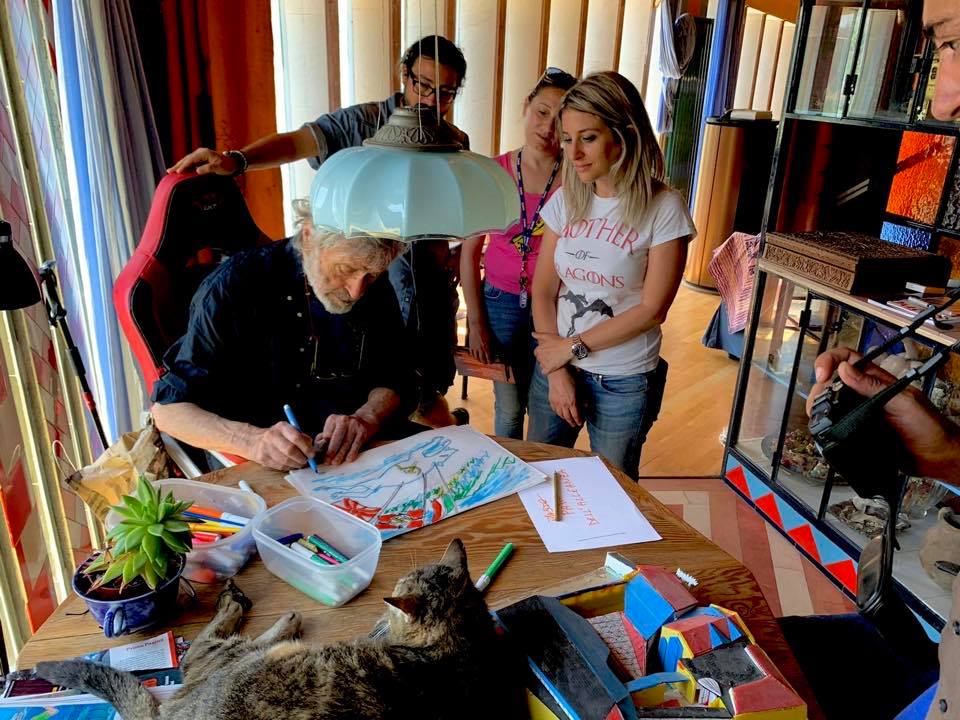 Poi a casa disegna per noi, mentre il gatto gli sonnecchia sui colori e Saba fa due giri di perlustrazione per capire se va tutto bene, se siamo amici, se Nik è al sicuro. Appoggia il muso sulle zampe e riposa, ma sempre con l’orecchio teso.